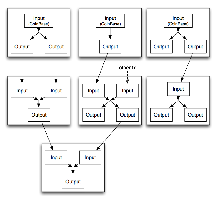 比特币的交易(Transation,缩写Tx),并不是通常意义的交易,例如一手交钱一手交货,而是转账。交易由N个输入和M个输出两部分组成。交易的每个输入便是前向交易的某个输出,那么追踪到源头,必然出现一个没有输入的交易,此类交易称为CoinBase Tx。CoinBase类交易是奖励挖矿者而产生的交易,该交易总是位于Block块的第一笔。