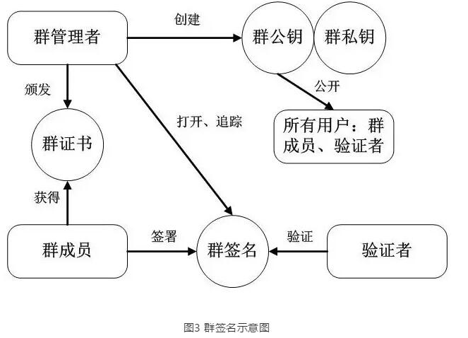 在一个群签名方案中,一个群体中的任意一个成员可以以匿名的方式代表整个群体对消息进行签名。与其他数字签名一样,群签名是可以公开验证的,且可以只用单个群公钥来验证。群签名一般流程: