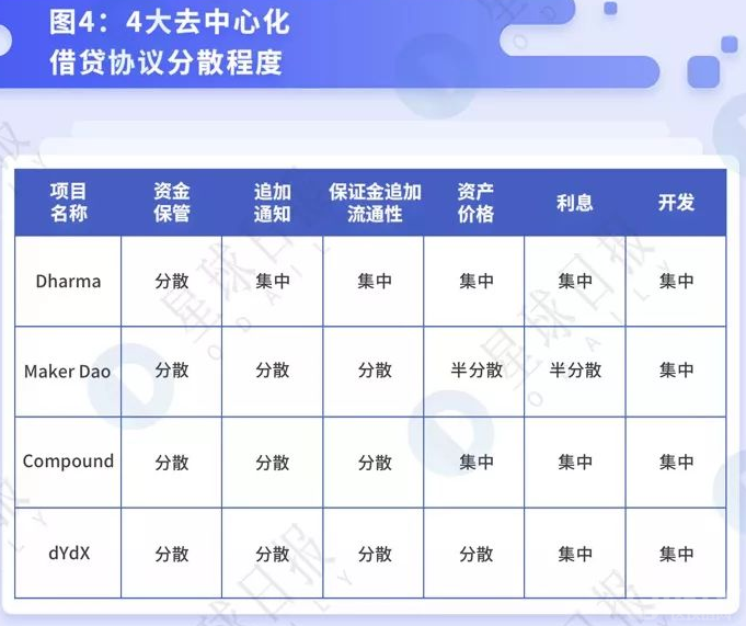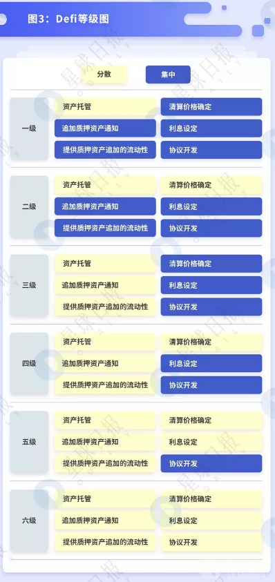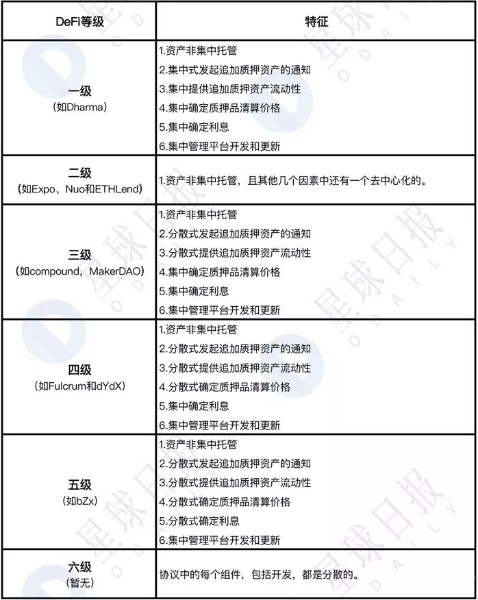 以传统金融为例,平台采取第三方托管仍是集中式的,当发生违约风险时,银行强制清算,资产价值由银行决定,借贷利息也由银行规定。而这些要素在不同项目中表现出不同的去中心化程度。据此,DeFi 可被划分等级。