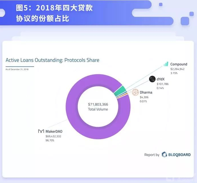 而贷款人在 2018 年提供了 3900 万美元的资产,其中 96% 通过 Compound,其次是 dYdX,集中化程度较高的 Dharma 则最少: