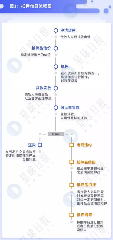 去中心化借贷平台常用的“抵押贷款”形式:借款人须将价值高于借款的资产作为抵押品,以保证在无法偿还债务的情况下,贷款人可获得抵押品。抵押贷款的业务过程如下: