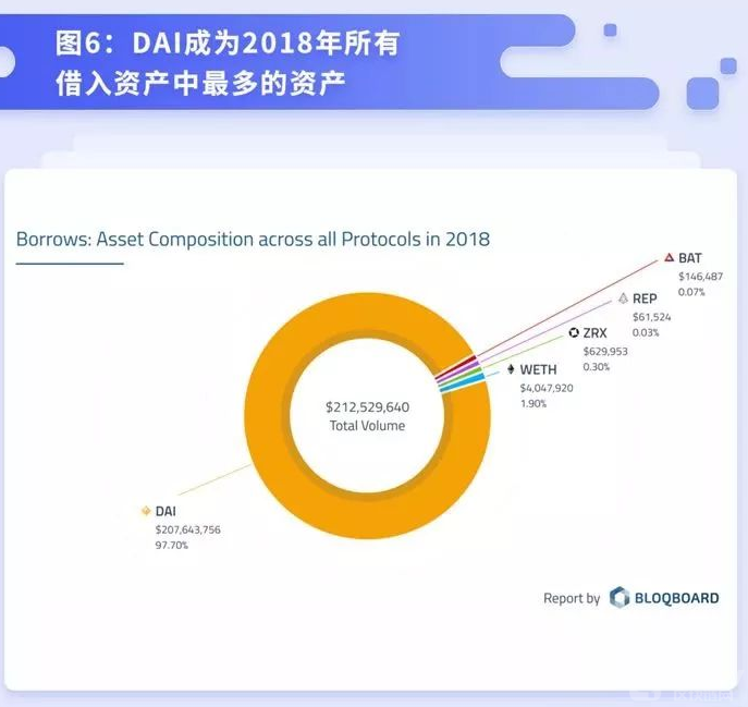 其中,DAI 成为 2018 年借入最多的资产(2.07 亿美元),占所有借入资产的近 98%。