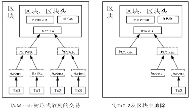如果最近的交易已经被纳入了足够多的区块之中,那么就可以丢弃该交易之前的数据,以回收硬盘空间。为了同时确保不损害区块的随机散列值,交易信息被随机散列时,被构建成一种Merkle树(Merkle tree)的形态,使得只有根(root)被纳入了区块的随机散列值。通过将该树(tree)的分支拔除(stubbing)的方法,老区块就能被压缩。而内部的随机散列值是不必保存的。