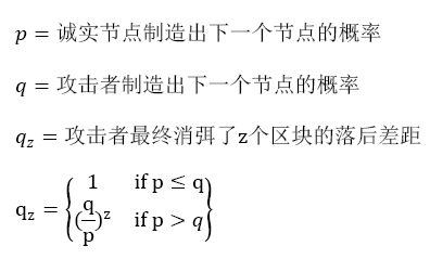 攻击者成功填补某一既定差距的可能性,可以近似地看做赌徒破产问题(Gambler’s Ruin problem)。假定一个赌徒拥有无限的透支信用,然后开始进行潜在次数为无穷的赌博,试图填补上自己的亏空。那么我们可以计算他填补上亏空的概率,也就是该攻击者赶上诚实链条,如下所示: