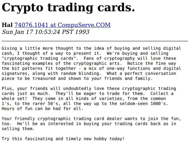 1993年,最有可能是比特币创造者中本聪的哈尔·芬尼(Hal Fenny) 提出了首个 NFT 的原型,加密交易卡 (Crypto trading cards)。 它是一种算法生成的哈希字符串代表的卡片。他认为“密码学狂热爱好者们绝对会爱上这些迷人的加密字符串艺术,由抽象字符串组成的加密交易卡不仅会成为好友之间的谈资,还会引发人们收藏、交易、集套盒等多种需求,不断创造新玩法和新热潮。”