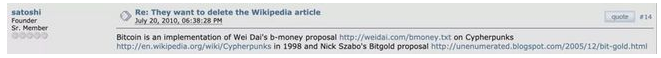 中本聪后来在比特币论坛上写道:“比特币是 Wei Dai 在1998年创造的 B-money 和尼克·萨博提出的 Bitgold 提议中诞生的。”