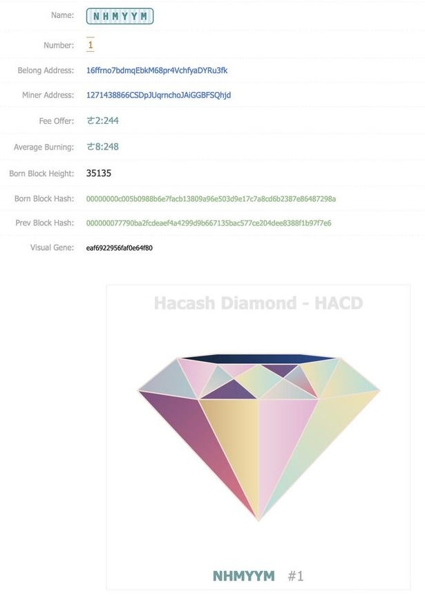 含有某方面的创新,具备首创价值 公平发行,有后来者可以持续的参与 完全社区参与驱动形成价值,塑造市场化 耗费算力成本挖掘,形成公允价值来依托 具有自下而上,去中心化二次创作的可能性 数量有限但不过分稀少,需要足够的人参与 具备一定的可视化鉴赏价值,而不只是艺术价值Hacash Diamond 作为首个文本 NFT,每一枚 HACD 都具备独一无二的钻石视觉,数量有限但不过分稀少,并且也是首个基于 PoW 机制的 NFT,具备与比特币一样的去中心化,同时是最接近芬尼1993年对 NFT的畅想和萨博提出 BitGold 的实现,也许这就是 NFT 的究极形态。