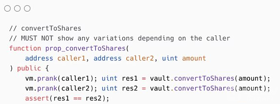 给定两个账户地址和金额,它使每个账户以相同的金额调用 convertToShares(),并确保两个返回值相等。此属性独立于实现细节 convertToShares()。这些细节因金库的不同而异,并且必须由任何实现 ERC-4626 的金库来满足。在这种情况下可以通过提供特定输入值(用于单元测试)、许多用于模糊测试的随机输入或用于符号执行和形式验证的符号值来执行此属性。它也可以在本地运行或针对主网分叉运行。