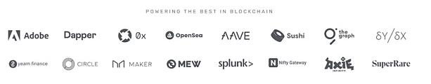 Alchemy (成立于2017年8月,总部位于美国加利福尼亚州)是区块链领域的开发者平台。Alchemy负责构建区块链的基础设施部分,开发人员可以将时间集中在创造出色的产品上。Alchemy 构建了自定义技术和工具,创建一个强大的平台,开发人员使用该平台来使他们的区块链项目工作。Web3 中的顶级公司都建立在 Alchemy 之上,诸如 OpenSea、Dapper Labs、Adobe、Axie Infinity 等公司。几乎每个 NFT 市场、大多数 DeFi 组织以及 70% 的领先 Web3 dapp (去中心化软件)都建立在 Alchemy平台之上。