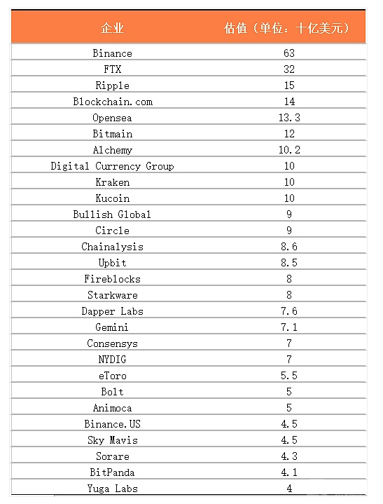 表1:部分区块链独角兽(估值40亿美元或以上)