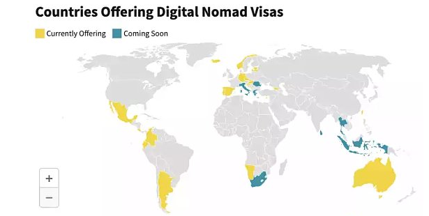 除了针对中国公民的签证政策之外,由于 Digital Nomad 在全世界的流行,尤其是新冠大流行之后,许多国家都已经或计划为 Digital Nomad 提供专门的签证以吸引更多的人来消费。各国的 Digital Nomad 签证大多允许持有人在其国内停留 1 年的时间,有的甚至更长,这显然比 15-30 天的旅游签证要有吸引力的多。不过,虽然 Digital Nomad 签证有效期很长,但是各国对签证的获取都有一定的要求,例如:工作证明,最低收入和收入证明,在该国的最低停留时间,最长停留时间,健康保险,不能在本国从事有偿工作等。根据 Ward Williams 在 Investopedia 上的文章《Countries Offering Digital NomadVisas》,当前有 49 个国家和区域已经或计划提供 Digital Nomad 签证,并标注在了下面的地图之上,具体国家可以进入 Williams 的文章查看。从图上可以发现,这些区域主要分布在欧洲,而东南亚、澳洲、南非和美洲有少许国家提供或计划提供。