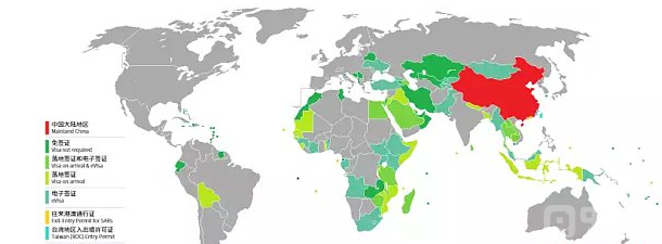 首先由于中国护照的特殊性,我们根据维基百科数据找到了下面这张图,它将为持中国普通护照的公民可以获得的签证分为了:1. 免签证;2. 落地签证和电子签证;3. 落地签证;4. 电子签证;5. 往来港澳通行证;6. 台湾地区入初许可证;7. 需要提前办理签证;8. 拒绝入境。同时根据不同地区的情况,将其标上了对应的颜色。从图上可以直观地看到中国护照相对便捷的区域主要分布在东南亚、中东、东欧、东非和部分南美洲。对中国公民实施免签、落地签的国家或地区的详情可以参考中国移民管理局 2019 年发布的《45 个国家或者地区对中国公民实施免签、落地签证政策》。