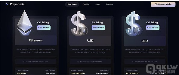 Polynomial建立在Optimism的Lyra Finance之上,使用Synthetix的合成资产,主要产品是Earn Vaults。这些Vaults是基于期权的自动化策略,可提供被动收益。如果选择合适的资金池,APY可能会很高(~30%),因为当策略盈利时,存款人通过期权费获得的收益率是可以复利的,同时还可以赚10%的绩效费。