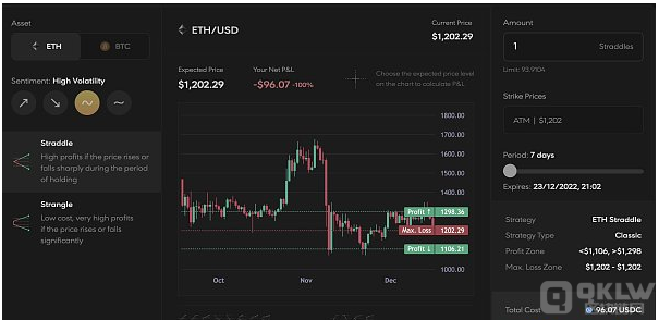 此外,在Hegic上还可以选择高波动性和低波动性,各提供两种策略。例如,选择高波动性,有Straddle和Strangle两种策略。