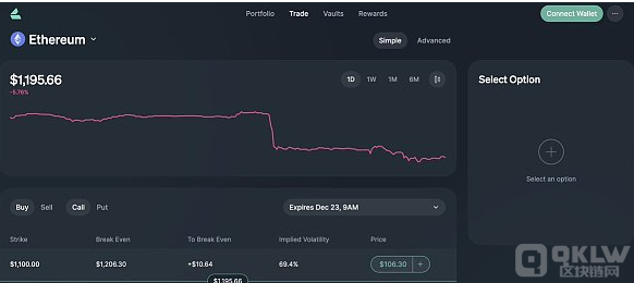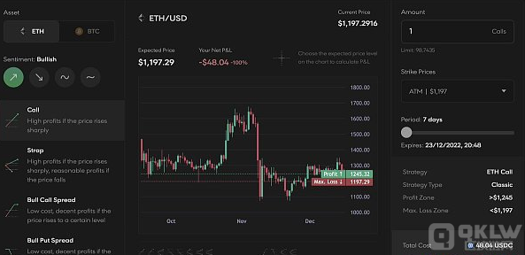 Lyra建立在Optimism之上,TVL为1300万美元。它的“简单”部分直观且易于使用,可以根据行权价和到期日选择买入或卖出看涨或看跌期权。