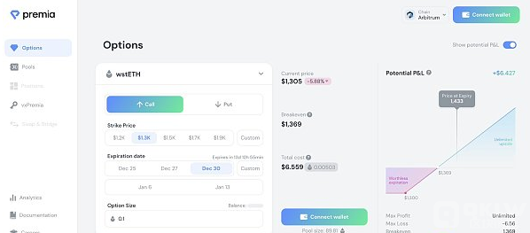 Premia已经部署在包括Arbitrum的多条链上,它的TVL一共700万美元。Premia的用户体验令人着迷,一切都很容易找到且是可视化的,它的期权可以在到期之前或之后的任何时间行权。