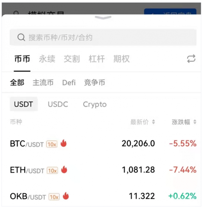模拟交易是用户在交易平台提供,与真实市场环境一样的模拟虚拟市场内使用虚拟资金进行交易的模式。模拟账户内一般会有一定数额的初始资金,用户可以像使用真实账户那样进行自由交易,并且无需承担任何资金风险,交易的结果也不会对真实的资产造成任何影响。一般情况下,模拟交易含有实盘的所有交易模式,在功能上也与实盘保持一致,在可交易币对方面,主要是一些常用的交易币对以及部分热度较高的币对,满足用户对交易币种的基础需要。