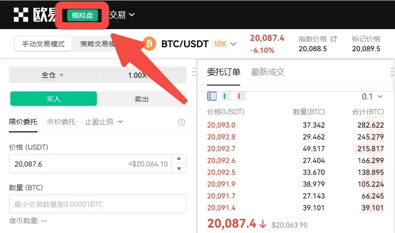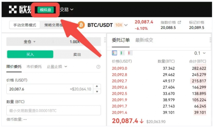 02 在左上角“欧易”旁会有模拟盘字样,用来区分是实盘交易还是模拟盘交易