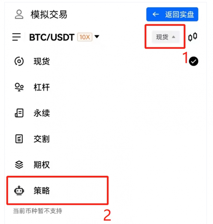 03 除了手动交易外,您可点击交易页右上角策略按钮,体验策略交易模式的便捷。