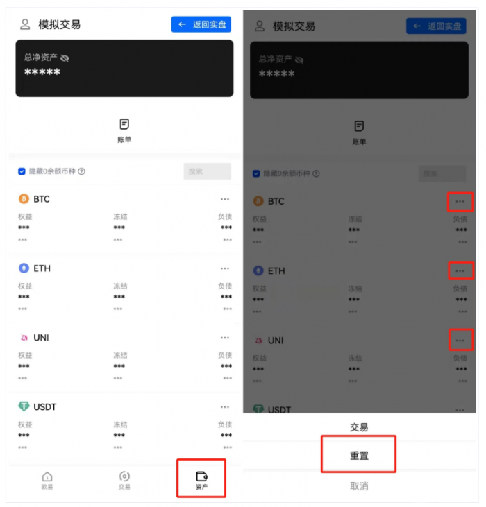 04 在模拟盘中,会有固定数量和金额的虚拟交易资金,当交易完成后不存在挂单或持仓时,即可在模拟交易资产页面中点击重置按钮进行模拟资产的重置。