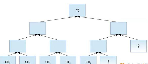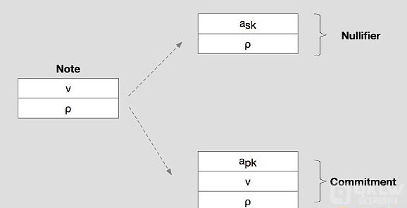 一笔转账用Note来表示,包括转账的金额v和一个随机数。Note有两个外在的表现形式:一个是Commitment,一个是Nullifier。Commitment和Nullifier都是通过不同的Hash函数生成。Commitment代表一次金额转入,Nullifier代表一次消费。注意,对于一个Note,Commitment和Nullifier都是唯一的。因为Commitment和Nullifier是Hash的结果,即使这两个数据公开,其他人也无法推断出Commitment和Nullifier之间存在联系。也就是说,提供一个Commitment,能说明进行了一笔转账(具体信息其他人未知)。能提供对应的Nullifier,就能消费。区块链,作为一个隐私转账平台,将所有的Commitment(cm),组成一个Merkle树: