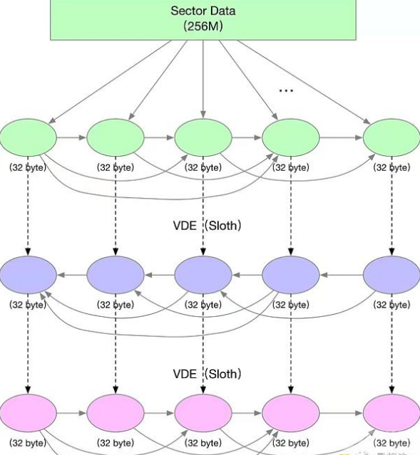 Sector中未Seal的原始数据首先依次分成一个个小数据,每个小数据32个字节。这些小数据之间按照DRG(DepthRobustGraph)建立连接关系。按照每个小数据的依赖关系,通过VDE(VerifiableDelayEncode)函数,计算出下一层的所有小数据。整个PoRep的计算过程分为若干层(目前代码设置为4层),仔细观察每一层的DRG关系的箭头方向,上一层向右,下一层就向左,因此得名ZigZag(**Z字型**)。