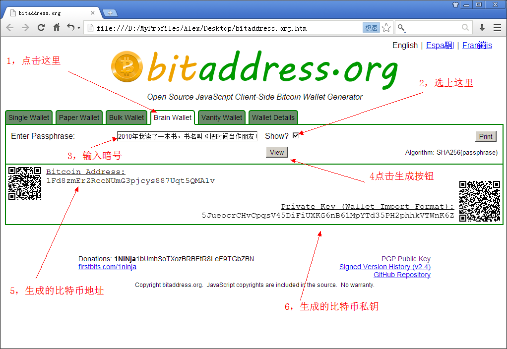 现在假设你已经保存好这个网页,并且复制到离线的电脑上用chrome 打开。以下是生成脑钱包的具体操作: