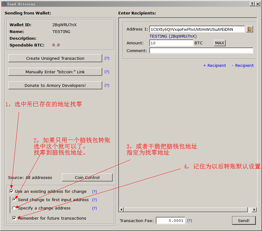 通过上面的设置,我们就可以避免脑钱包上的比特币糊里糊涂地被找零到新地址上了。