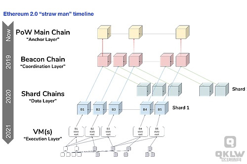 在这些代号概念之外,同时还有另一个概念,那就是以太坊2.0。以太坊2.0将通过多层结构(信标链),引入分片和Casper共识(即Pow/PoS混合制)来提高以太坊本身的鲁棒性和TPS。