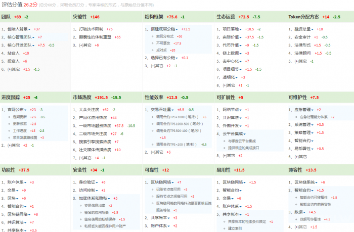 评估分值为60分,用户可以打分,也是我们今天要讲的内容,有15个大项目,内容包括:团队、突破性、结构框架、生态运营、Token分配方案;进度跟踪、市场热度、性能效率、可扩展性、可维护性;功能性、安全性、可靠性、易用性、兼容性;评估分值单个项目的分值从1-10分不等,约有500多个小项目。