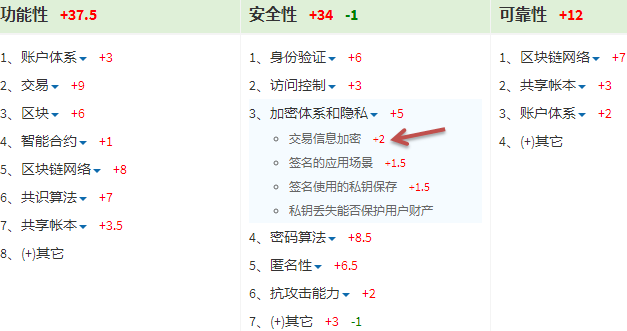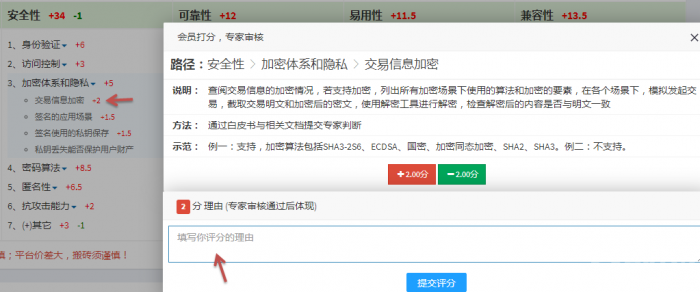 我们在评估分值下属的大项目里面选定你要进行评分的小项目,比如“安全性(一级目录)——加密体系和隐私(二级目录)——交易信息加密(三级目录)”的“交易信息加密”小项目。