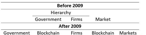但同时,区块链与公司及政府也有竞争关系。区块链是一种制度技术。和政府及公司不同的是,区块链是一种维护账本的新型方式,即协作性经济活动。